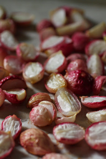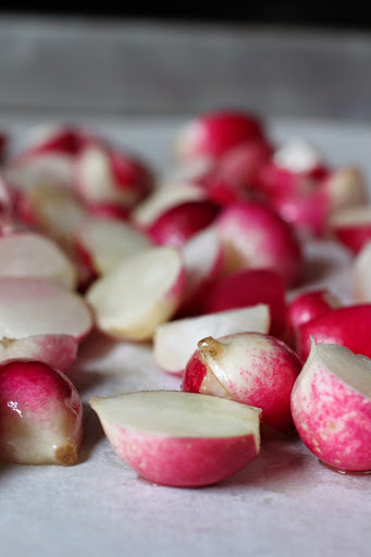lately, i have been roasting everything. i love the slightly caramelized flavor it gives the vegetables and since i’m not a big fan of radishes in the raw state, i thought maybe roasting would help. a light coat of olive oil and a sprinkle of salt and into the 425 degree oven they went. it took about 20 minutes to get the right state of roasted/softened for my palate.