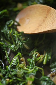 while the greens can be a little fuzzy and unpleasant raw, they are wonderful when cooked. a quick saute of onions and garlic in olive oil got the dish started.