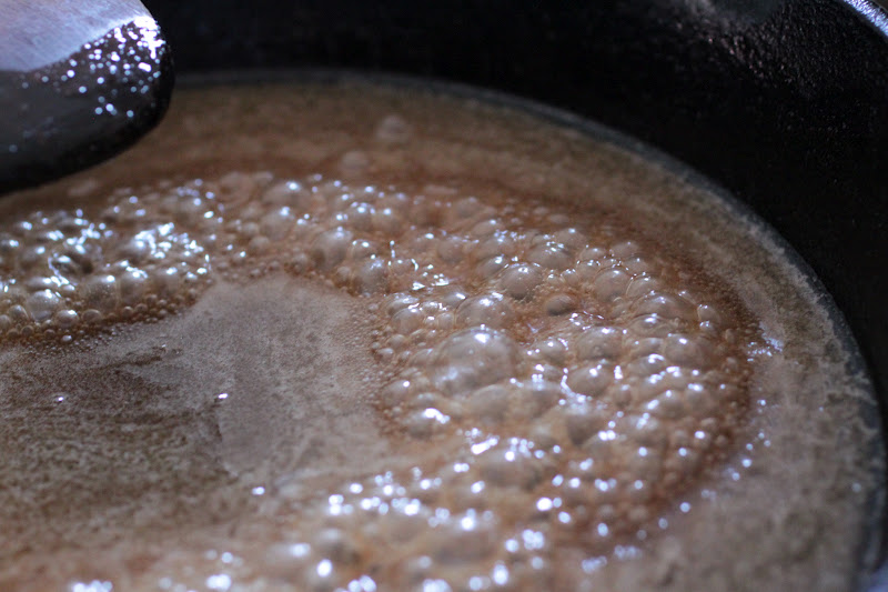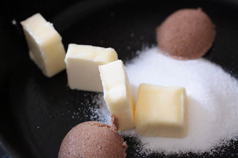 in my favorite cast iron skillet, i melted butter, sugar, brown sugar and honey.