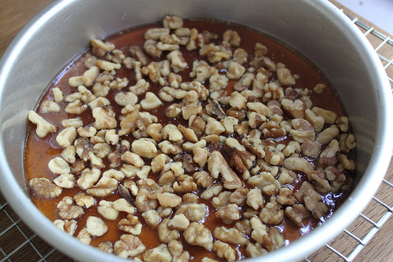 place the nuts in the shell and pour the syrup over them-this gets them coated with the syrup and the ones on top look shiny and taste a little caramelized when the tart is fully baked.