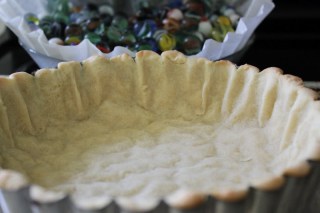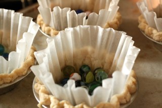to get a perfectly baked pie or tart, one must start with a partially baked shell. there is nothing worse than getting a forkful of gummy under baked crust along with a bite of pie! here i use my favorite trick-a restaurant sized coffee filter and marbles. coffee filters are designed to hold a large amount of wet grinds without tearing. they absorb a little of the grease so that it doesn’t stick and you can literally lift the filter with the weights right out of the tart shell and set it aside to cool. filters do not get brittle like parchment, they do not cause creases and cracks like foil and they do not melt like wax paper so if you can get ahold of some, give it a whirl! and just so that you don’t think i have lost my marbles, those are my pie weights!
