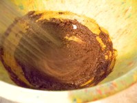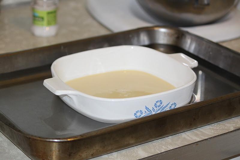 the turtle pie topping is made from a single can of sweetened condensed milk that has been baked to caramelize it.  on the left, straight out of the can and on the right, after two hours of baking.
