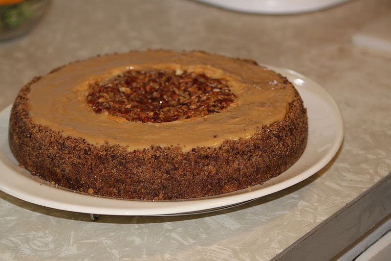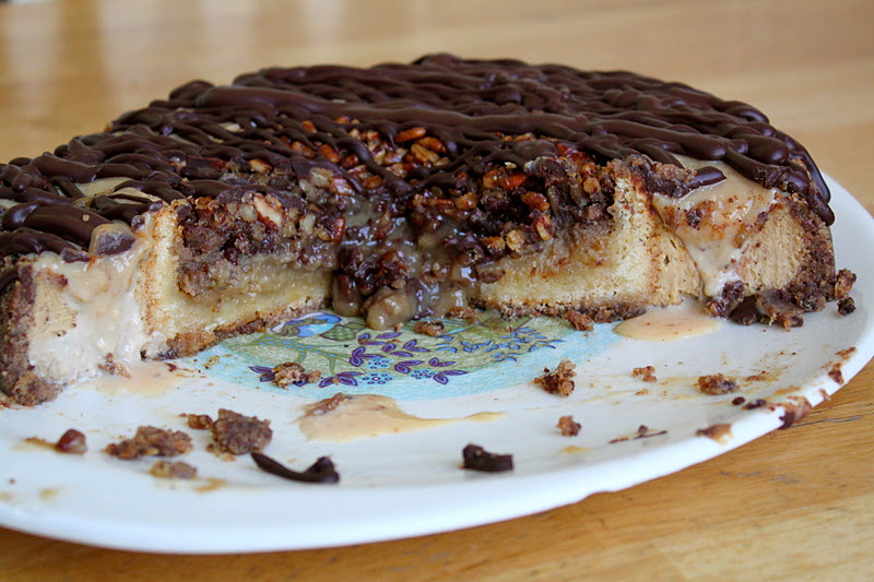 to assemble, place the cold pecan pie in the center of the cheesecake pan.  carefully spoon the filling around it without getting any on top of the pecan pie.  bake the cake for 45 minutes then carefully run a knife around the edge of the cake to release it from the pan and prevent cracking.  turn the oven off and leave the cake in the oven with the door just slightly open for 15 minutes.  remove from the oven, the cheesecake should be slightly puffed and feel almost firm to the touch.  let it cool and then chill it overnight before proceeding with the turtle pie topping.