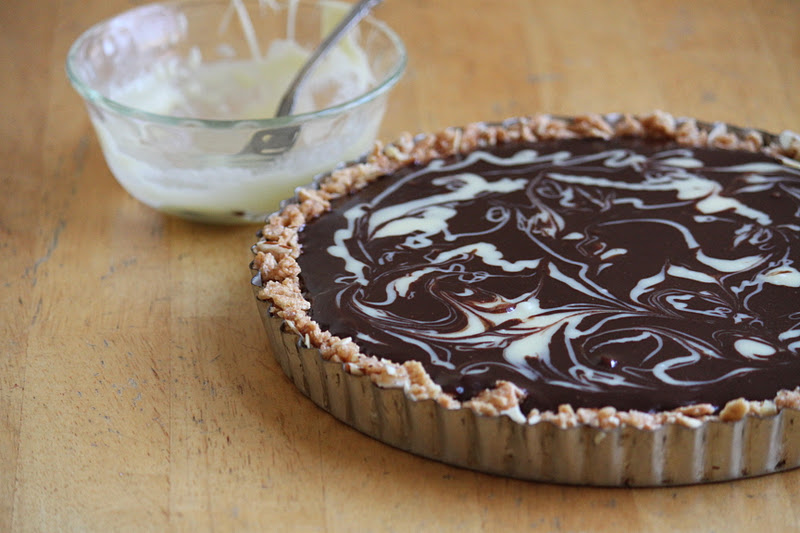 mix the ingredients in a microwavable bowl and heat it on the lowest setting until it is melted, about 30 seconds.  stir until smooth and then using a small spoon, drizzle all over the top of the tart.  take a tooth pick and swirl the white chocolate into the tart so that it is marbleized.  carefully place the tart in the fridge to cool and set for at least 2 hours.  to serve, remove the ring and carefully insert a thin palette knife between the crust and the metal bottom.  move the palette knife around to completely release the crust and then slide it onto a flat serving platter.  to cut, use a hot, wet knife taking care to completely clean the blade between slices for perfect cuts.