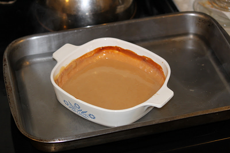 heat the oven to 350.  pour the sweetened condensed milk into a small covered casserole dish.  place the dish in a pan of water so that the water comes up to the same height as the milk.  carefully place in the oven and bake.  every 30 minutes, remove the pan from the oven and whisk the milk completely to ensure even caramelization.  this will take about 2 hours and during that last 30 minutes, you may have to do this a little more often to prevent scorching.  using the photos above as a guide, top the cheesecake portion (after you have taken the cake out of the pan!!!) with the caramel.  chill completely before topping it with the chocolate mixture.