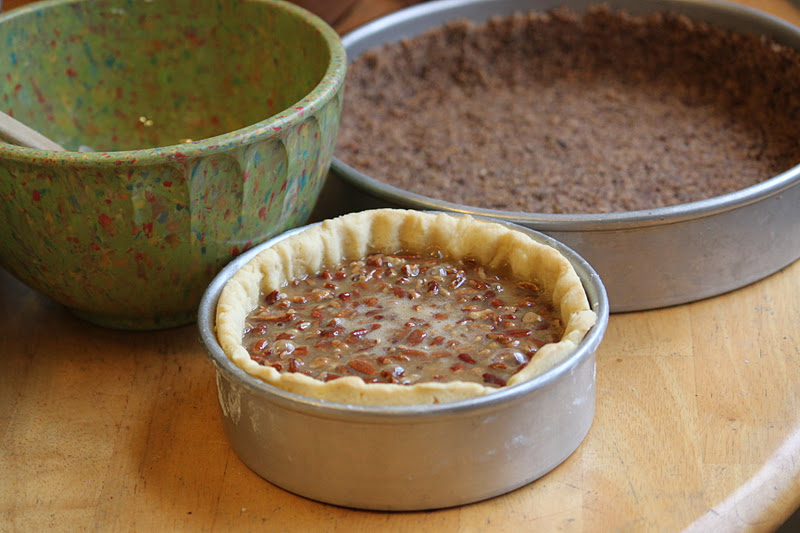 remember last year’s big thing-cherpumple cakes?  when i saw them posted all over the internet, i wanted to try one.  then i saw the recipe-frozen pies and cake mix…major disappointment! no time to play with that many scratch recipes this week.  instead i decided to bake my own version based on things my family enjoys.  there was one holiday season that after baking about a bejillion pies in the cafe, i refused to make any for our annual thanksgiving trash can turkey extravaganza.  needless to say, even though they enjoyed the pumpkin cheesecake i baked, they missed having a pie on the table.  this year i decided to combine two pies with a cheesecake and see what would happen.