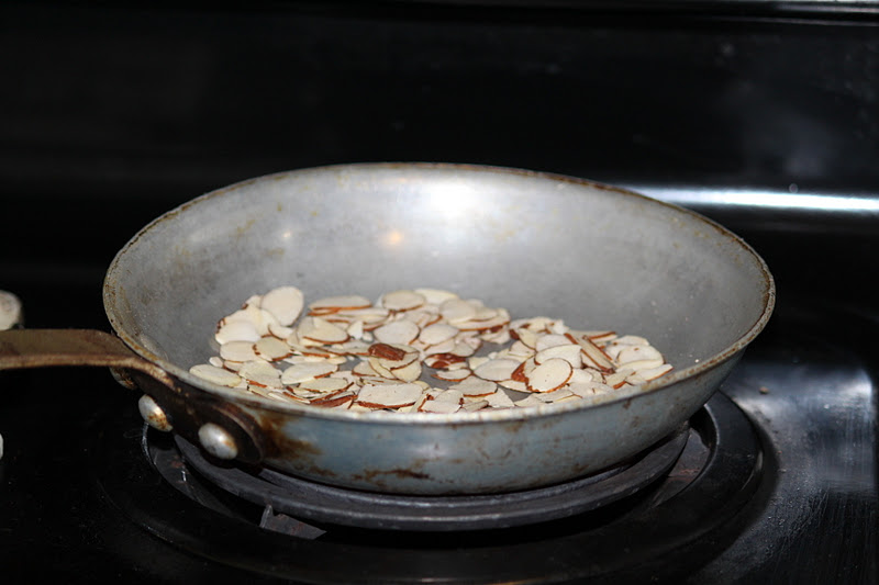 to make the crust, i crushed the cereal after i measured it.  don’t turn it into a powder but rather a collection of crumbs that are not completely uniform in size.  to punch up the almond flavor, i toasted some almonds in a skillet on the stove so the tart was truly a no-bake tart!