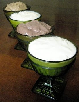 a flight of puddings to satisfy everyone at the table. from front to back; vanilla, chocolate, tapioca and butterscotch.