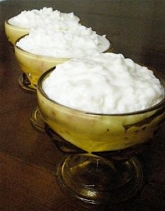 this week’s assignment: pudding. not very exciting, i know. even so, if you stop and replay your childhood, there are memories of pudding lurking in the shadows. little dishes of creamy pudding with a dollop of whipped cream (most likely shot straight out of a can or spooned out from the tub and plopped on top). vanilla, chocolate, butterscotch or something more substantial like tapioca or rice pudding. maybe you were lucky enough to have a family member who made bread pudding on special occasions, i never did. my husband always mentions kugel when it comes to pudding, specifically noodle kugel; he does come from a jewish family so that shouldn’t surprise anyone. when i was a kid, we had pudding on occasion. open the box, follow the directions and presto, pudding in a cup. if not a box, premade cups of it were purchased from time to time. i even remember visiting the deli down the street(showing my yankee heritage here, we had delis in every town) and buying rice pudding by the pound-a quarter pound goes a long way! mostly, i remember my mother making tapioca pudding. every now and then, she would buy a box of mix and make it. she would pour it into little pyrex bowls and sprinkle a tiny bit of nutmeg over the top. my mom is not a baker and she didn’t make many desserts at home besides cookies but she would make two things that i still remember; angelfood cake and tapioca pudding. i still like it. as weird as the texture is, i find something comforting about it.