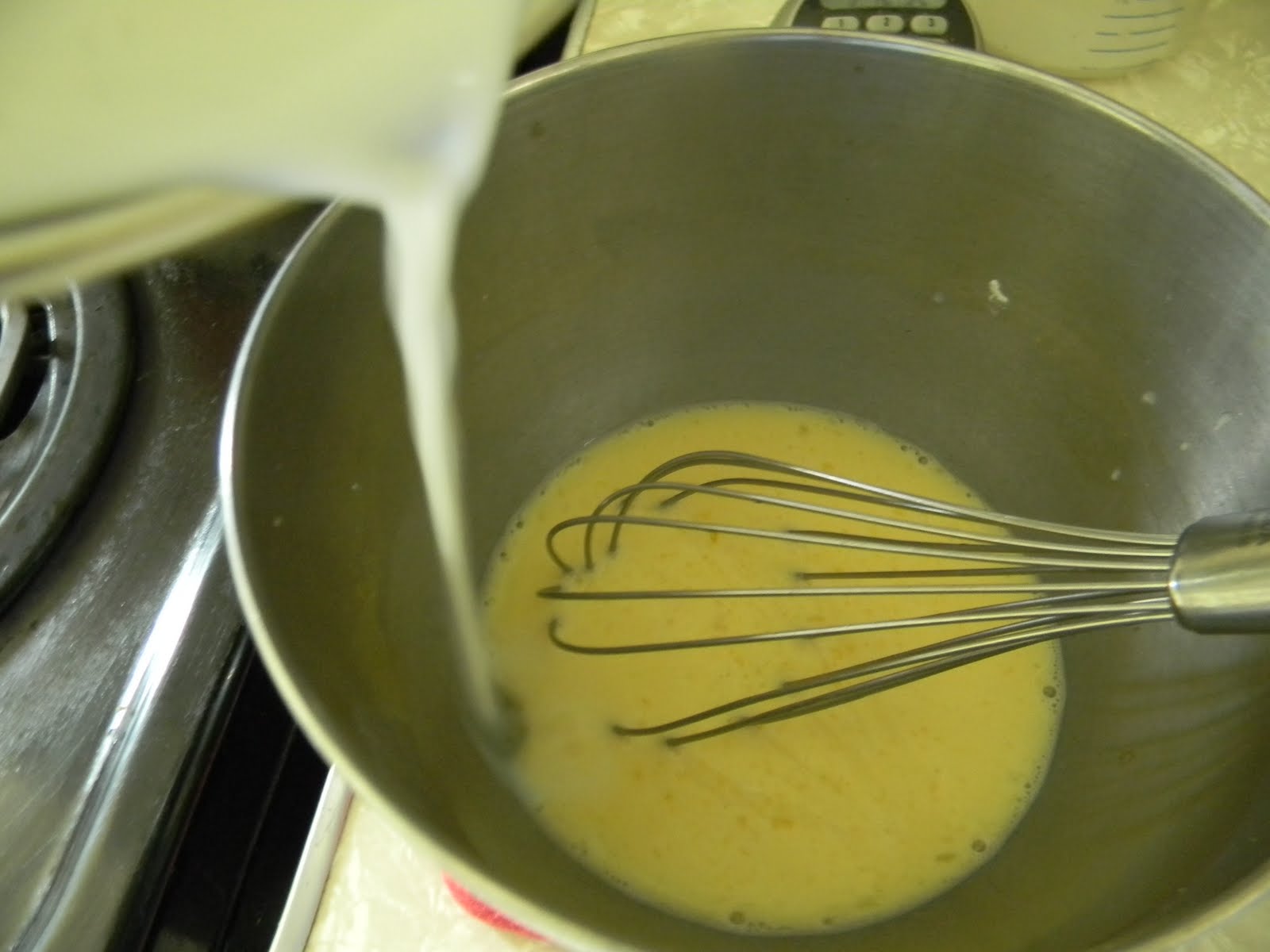 cornstarch is mixed with some milk to dissolve it and then the eggs are whisked in. classically referred to as a liason, this combination will thicken the custard filling.