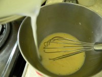 once the milk reaches a slow boil, whisk a portion of the hot milk into the liason and then return the remaining milk in the pot to the heat. while whisking the boiling milk, the liason is carefully added. and whisked continually until it boils and thickens.