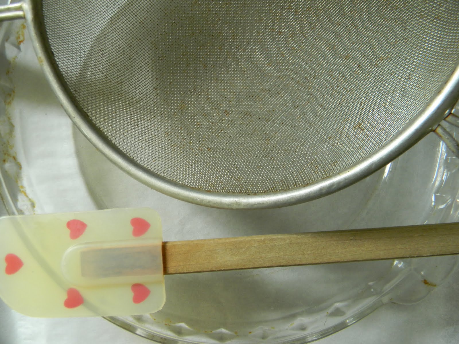 once finished, pour the custard into the strainer and use the spatula to force it through the mesh into the bowl.