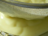 the reason for the strainer, all the little rubbery bits and the vanilla bean need to be removed or you will not have a creamy filling for your tart.
