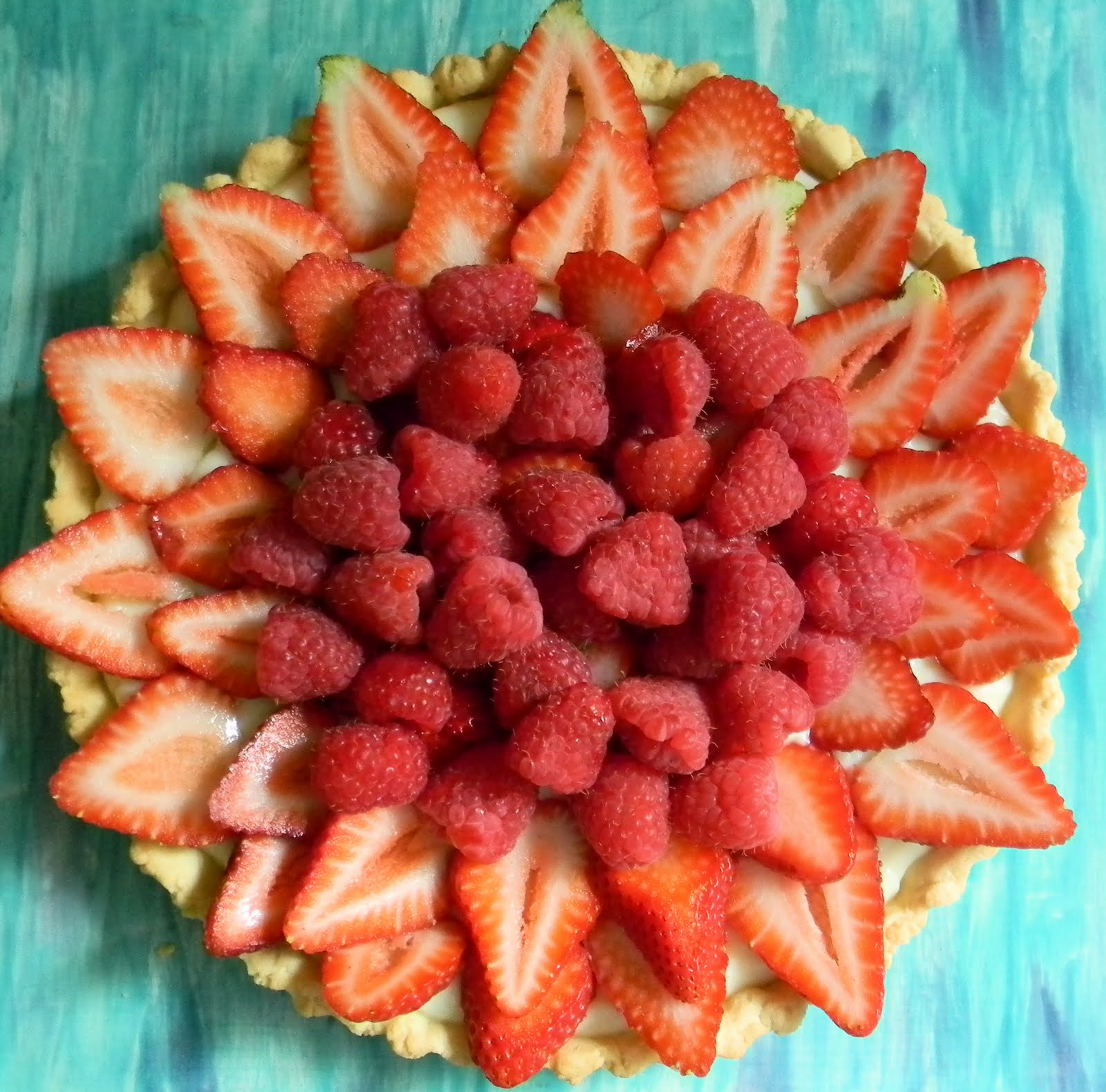 the first day of summer, or summer solstice as some call it, usually means hot weather and in that respect, we have had plenty. since it is so hot, i decided to make a fruit tart rather than heat the house up by using the oven to bake a pie. right now, markets are brimming with fresh berries of all types. for some reason, summer holidays mean truckloads of berries at almost affordable prices. why is that? in the summers of my childhood, picnics in honor of summer holidays always meant popsicles and watermelon slices-berries were for special occasions. on my last trek through the grocery store, i stocked up on strawberries and raspberries and luckily, enough survived to decorate the tart!