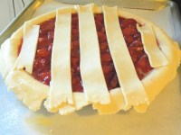 preheat the oven to 350. fill the pie shell and carefully brush some egg wash around the edge. lay the lattice strips according to the directions with the photos and if desired, you can brush each strip with egg wash as you go or wait until it is finished. sprinkle with a little sugar and bake until the filling is bubbling in the center, about an hour. let the pie cool to room temperature before cutting or the filling will run out.