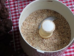 for the chocolate version, i used chocolate graham crackers and sliced, natural almonds which were first toasted and then pulsed in the food processor to make them more like sawdust.