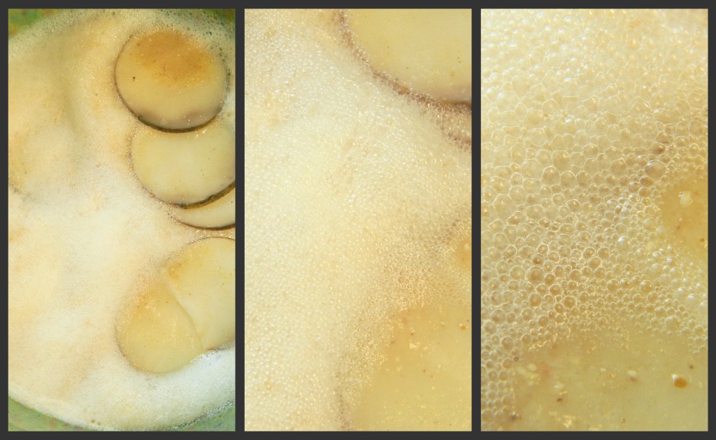 place the potatoes in a bowl and add the water. stir in the remaining ingredients and place this somewhere that the temperature will remain warm constantly-i used my oven with the light on. allow this to sit for 24 hours which will give it time to get foamy on top and develop the bacteria and the cheesy smell. remove the potatoes and discard them.