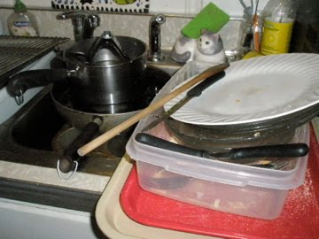 his pile includes trays and plates and pots and pans. the result, a tasty dinner of fried chicken-yes fried, we have temporarily lifted the moratorium on fried foods but only because this dish didn’t require a vat of hot oil.