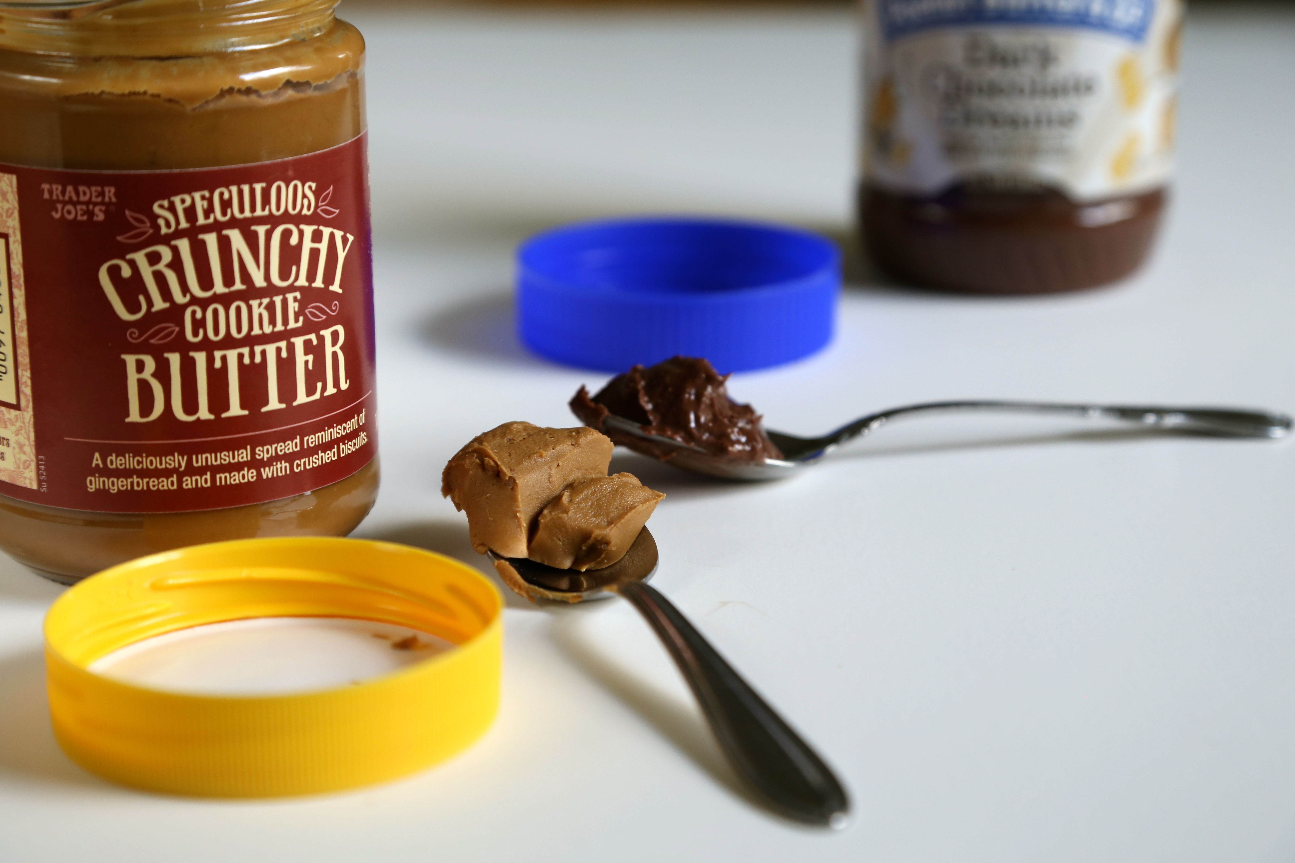 Now back to the secret filling. When I saw that I would need to buy a jar of Nutella, I thought it would be better to choose a spread that I would enjoy and might actually use. My first choice was Dark Chocolate Dreams by Peanut Butter and Company. And because I can never do anything simply, I also picked up a jar of Speculoos Crunchy Cookie Butter from Trader Joe’s.