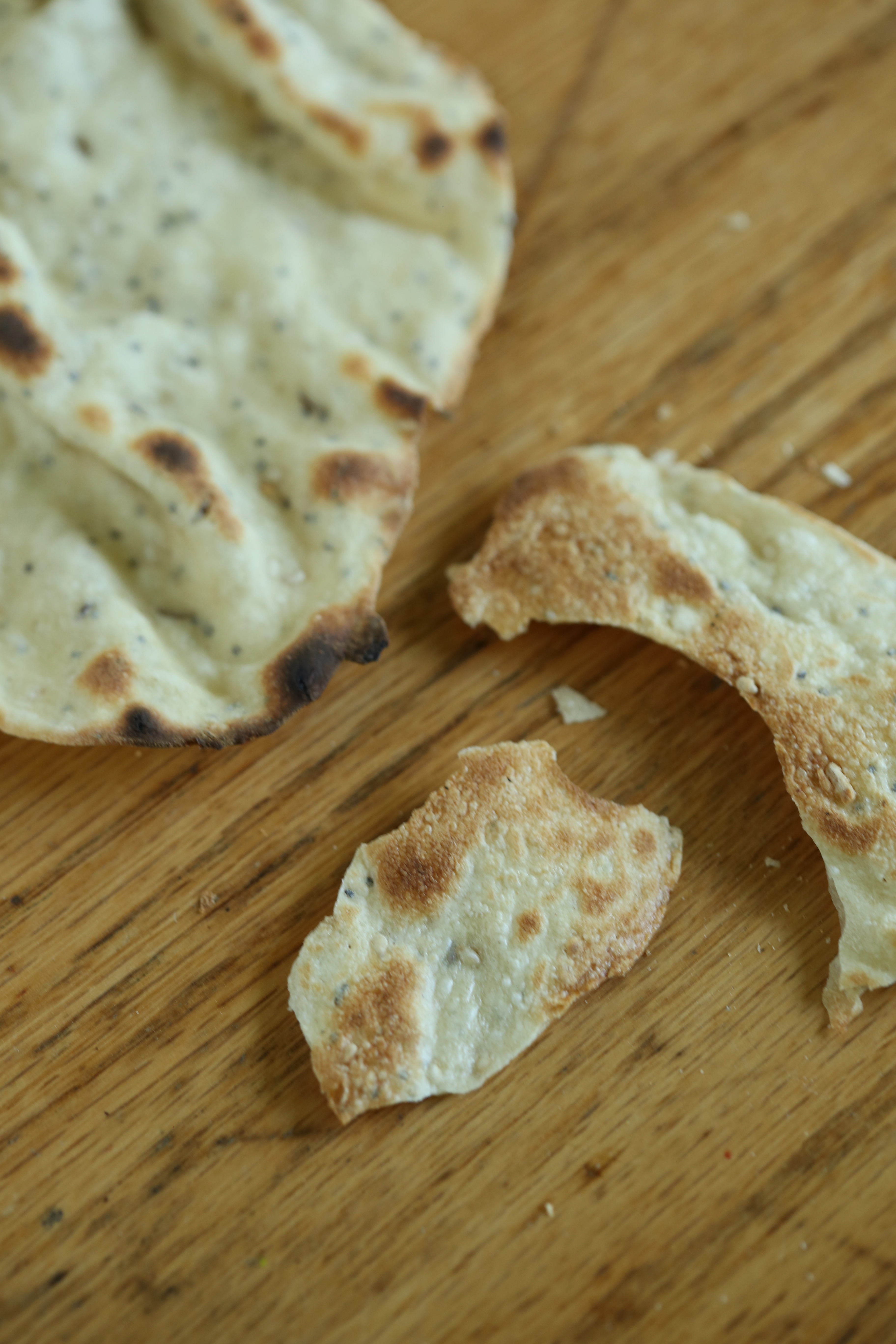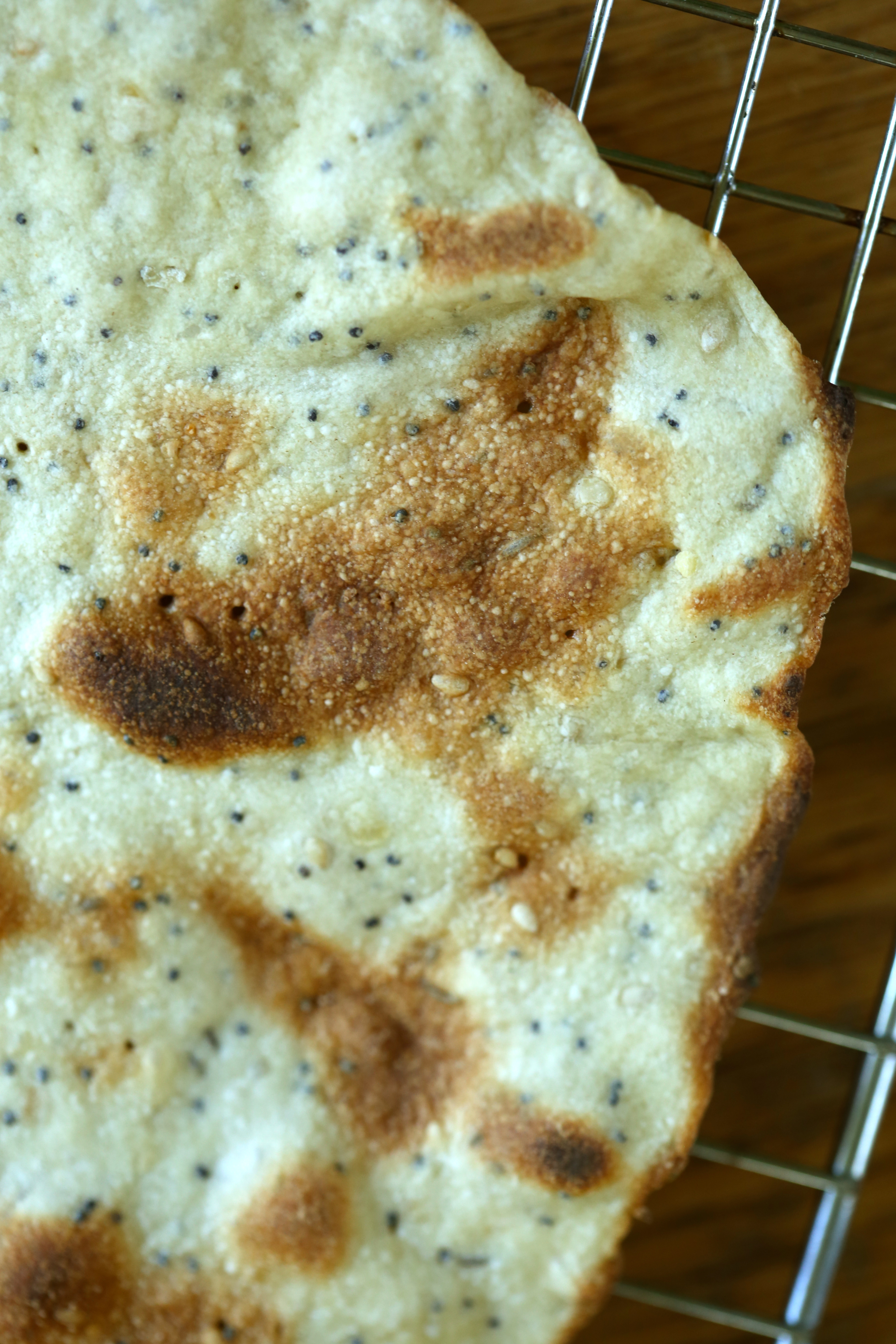 The recipe instructs you to roll the dough as thin as possible. Easier said than done. First of all, the use of flour is necessary but you must be careful with the amount. For this recipe, less really is more. You need the dough to be a tiny bit sticky so that it doesn’t slide all over the surface but you also do not want it to stick to the pin. The best tip I can share is to repeatedly roll, lift the dough and flip it and roll again. This constant lifting and flipping will also stretch the dough. The only bad news in this step, you can only roll the dough as thin as the seeds you add to it. But this is also a good thing because if you add the seeds and they are evenly distributed through the dough, they will act as guides for the pin and prevent you from rolling it too thin, which is probably not possible with matzoh dough.
