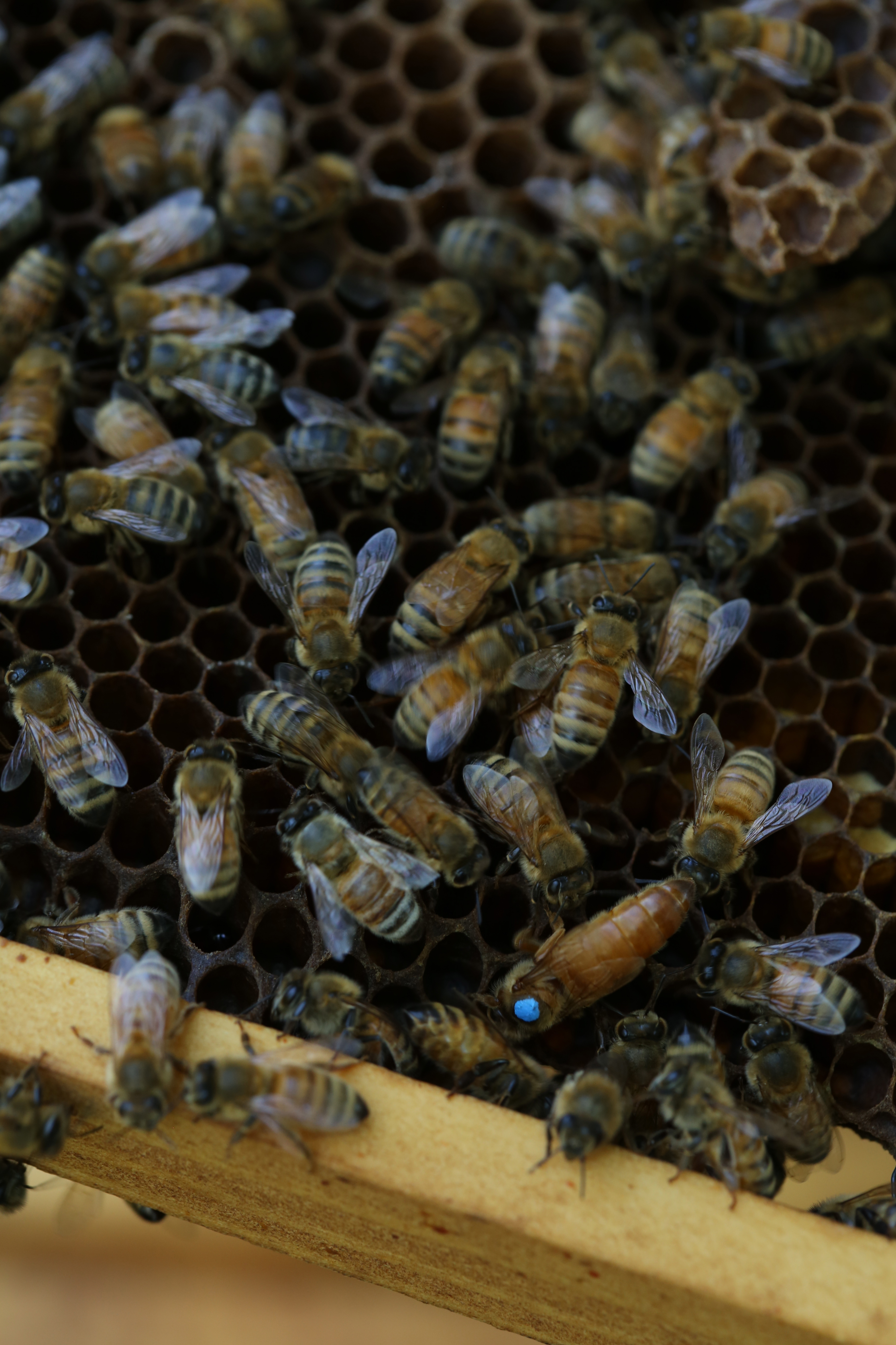 As we pulled frames out, we found capped brood and larvae and of course, her majesty, the queen. Can’t figure out which one she is-that big blue dot should make it obvious.
