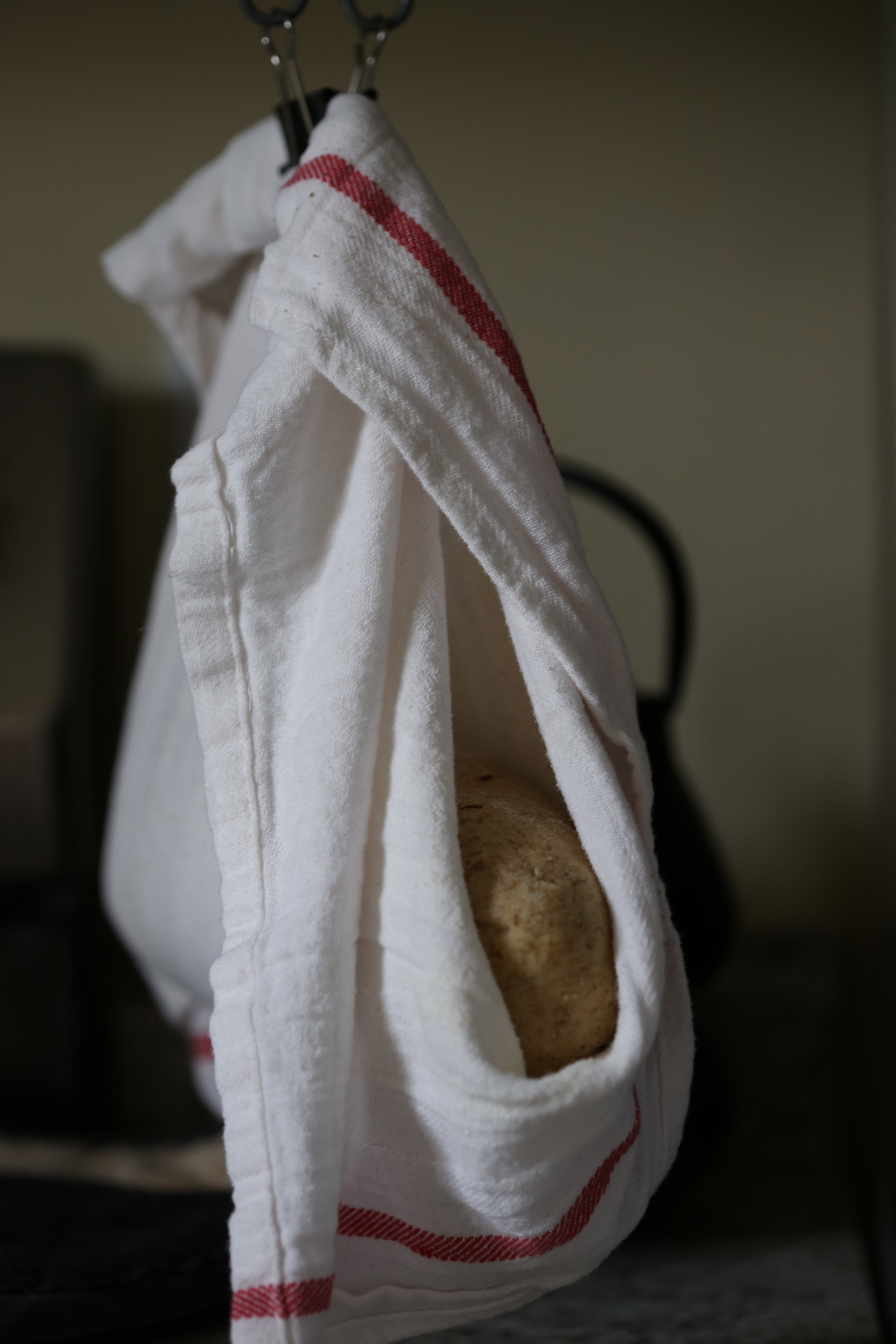 Just as the recipe instructed, I hung the shaped loaf in a towel sling and heated the oven. As the bread hung in kitchen, it continued to rise and I could see it splitting and I knew it would not get any better in the oven. Rather than get mad, I decided to take this as a lesson and make another half batch. This time though, I would make a few changes.