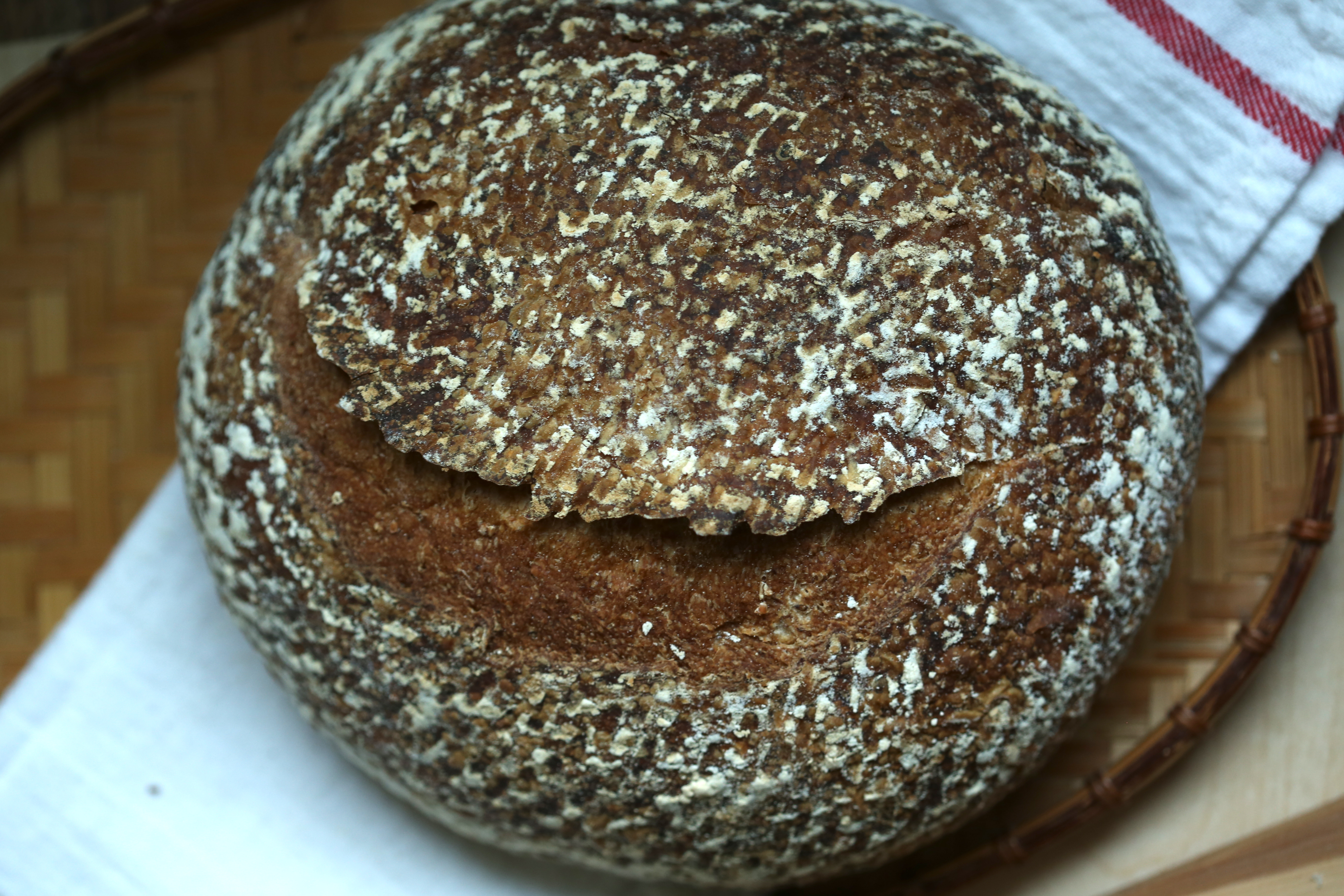 When the time came to bake the loaf, I was excited-this one actually rose! There was oven spring too-it rose more! The only thing I did not understand was the pale color of the crust on the top, it browned nicely on the bottom. The interior looked nice, no stripes and no gummy crumb. It also had a nice sour flavor. As for that piece I set aside, I used it to start a new loaf but this time, I made a full batch.