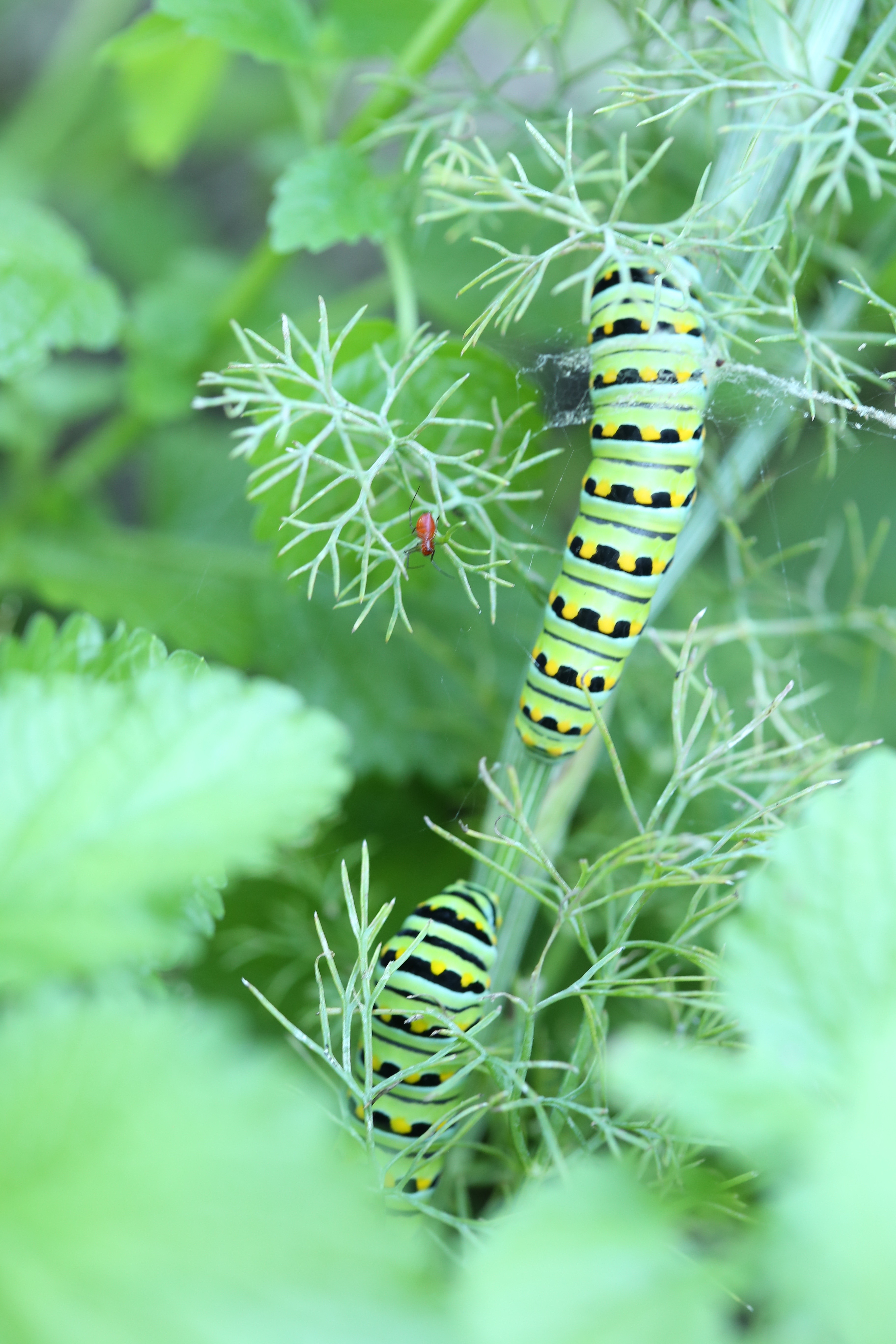 If you take a moment to look in all of the carrots and parsley, you will find swallowtail caterpillars. Lots of them actually, probably about two dozen or so out there now. We have a variety of swallowtail butterflies that visit the garden; zebra, tiger and spicebush swallowtails are abundant but these are zebra swallowtail caterpillars.